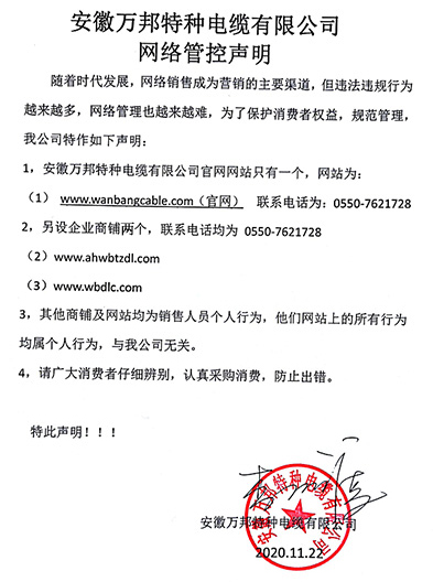 鄭重聲明:安徽萬邦特種電纜有限公司官方網站為:www_wanbangcable_com.cdwld.com.cn,除此之外無任何子網站或合作網站,其余均為假冒偽劣。電話:0550-7621728 13485756353 地 址:安徽省天長市滁州高新技術產業開發區經四路29號